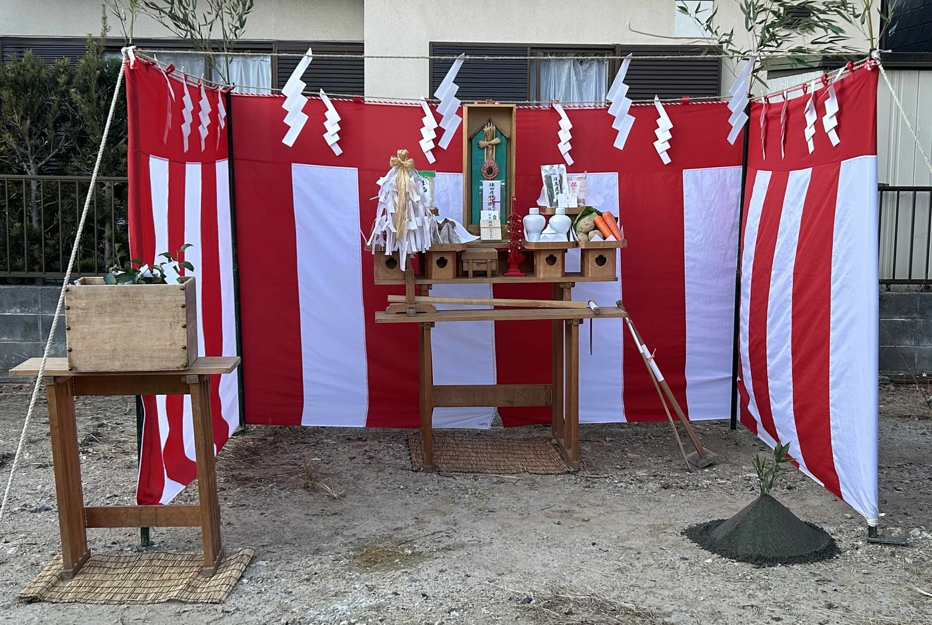新築の「地鎮祭(じちんさい)」は、建物を建てる前、工事を始める前にその土地の神様(氏神様など)を祀り、工事の安全と建物の永遠の安泰、そして住む人の繁栄を祈願する儀式です。