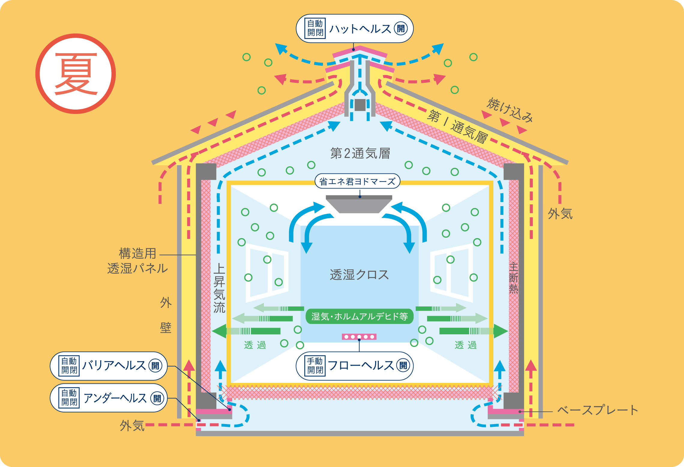 ★ 夏の仕組み: 壁の中にある通気層の空気(感知作動装置)が熱を感知して開き、床下の冷たい空気を上昇させて熱気を外に逃がします。