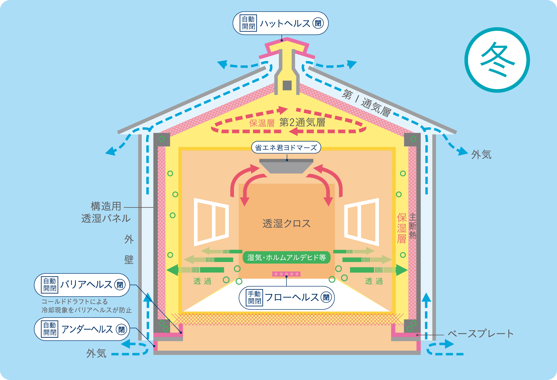 ★ 冬の仕組み: 寒くなると装置が自動で閉まり、壁の中に空気の断熱層を作ることで、魔法瓶のように家の中の暖かさを保ちます。